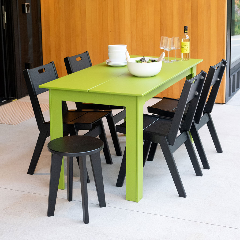 Loll products are made with recycled high-density polyethylene (HDPE) primarily from milk jugs. Milk jugs are used due to their lack of pigment so Loll’s vibrant colors can be created. As Loll material is a post-consumer recycled material, the medium to create the material does inevitably fluctuate. Although we do continuously strive for the best consistency possible, material color and texture may slightly vary from sheet to sheet and thus product to product may have slight variances. However, with that said, its nothing to worry about as we do our best to catch these inconsistencies in the shop. We also use USA made aluminum inserts mated with a 304 grade stainless steel bolt in all joinery. Richlite paper composite is used for structural elements in some pieces. Arbor Wood thermally modified wood can also be found in a select few products. All our materials are chosen for their high quality, no maintenance, performance and longevity. We want you to enjoy your furniture, not work on it.
